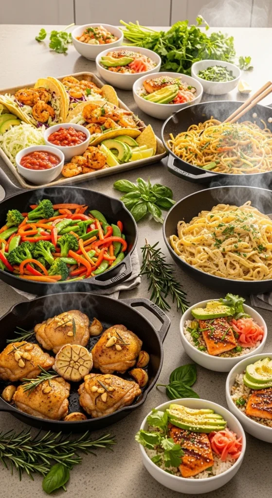 Busy nights call for fast meals that still taste homemade. These 30-minute dinners focus on one-pan cooking, quick skillets, sheet pans, and speedy bowls so you spend less time cleaning and more time eating. Simple ingredients, bold flavors, and family-friendly options make this list perfect for weeknights.