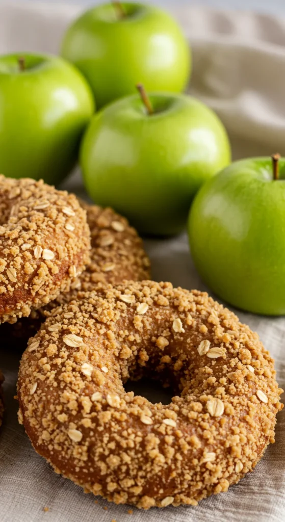 Crumb-topped donuts with a tangy apple glaze — crunchy outside, soft inside.