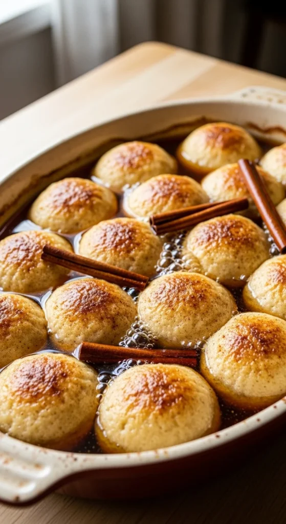 - Melt butter with sugar and cinnamon; pour over dumplings.