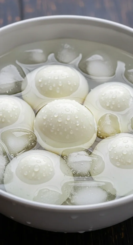 Let them sit in the ice bath for at least 10 minutes. This also makes peeling easier since the cold water causes the egg to contract slightly away from the shell.