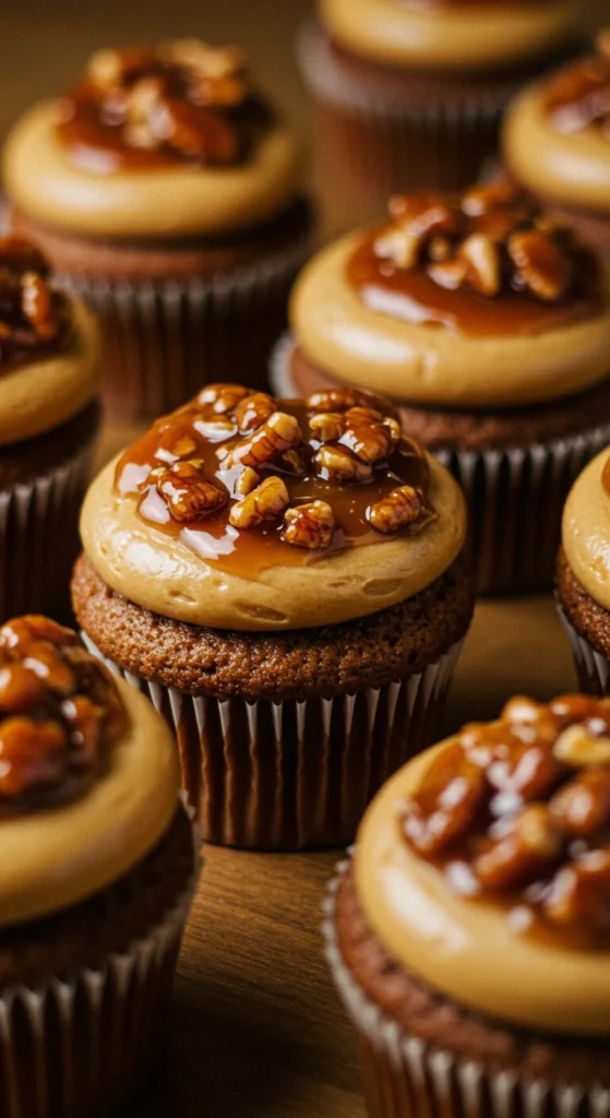 Moist cupcakes with crunchy praline and bourbon flavor.
