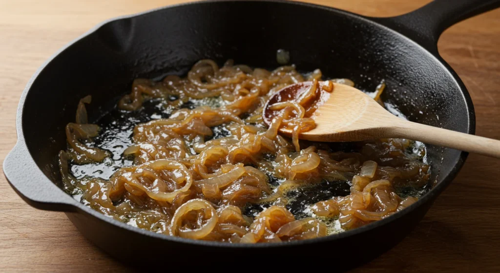 Pro tip: A wide pan gives the onions more surface area to cook evenly. Avoid crowding — if the onions are piled too high, they’ll steam instead of caramelize.