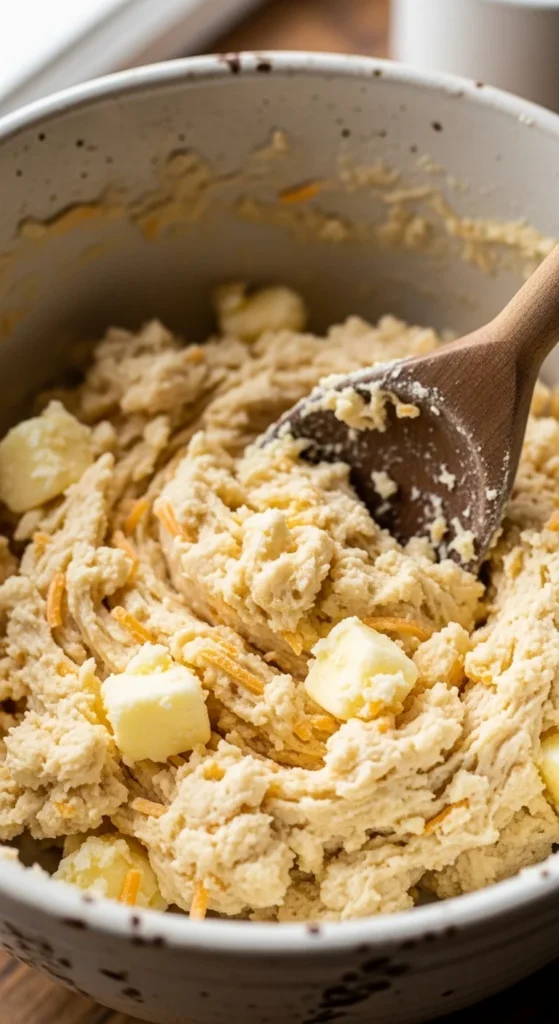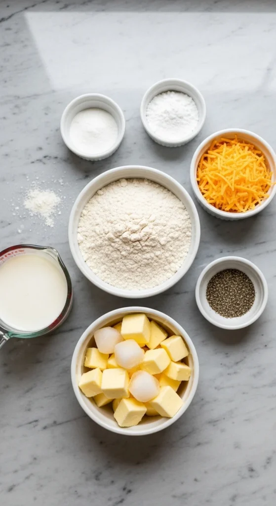 Most classic versions start with flour, cold butter, cheese, and buttermilk. From there, the magic is in how you handle the dough. The less you work it, the softer the biscuits stay.