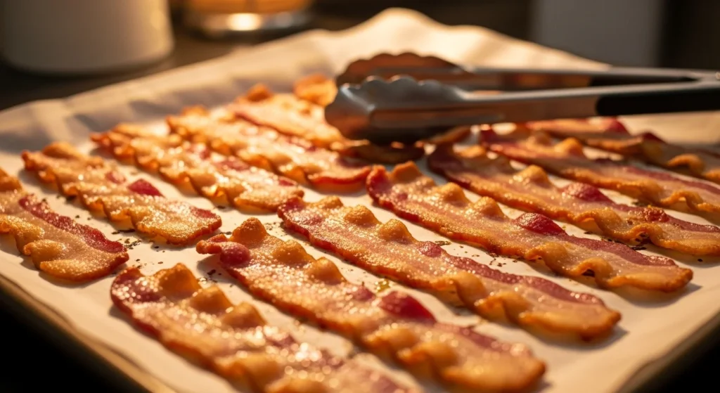 Once it’s cooked to your desired crispness, use tongs to transfer the slices to a paper towel–lined plate. This step helps remove any excess grease and keeps your bacon perfectly crunchy.