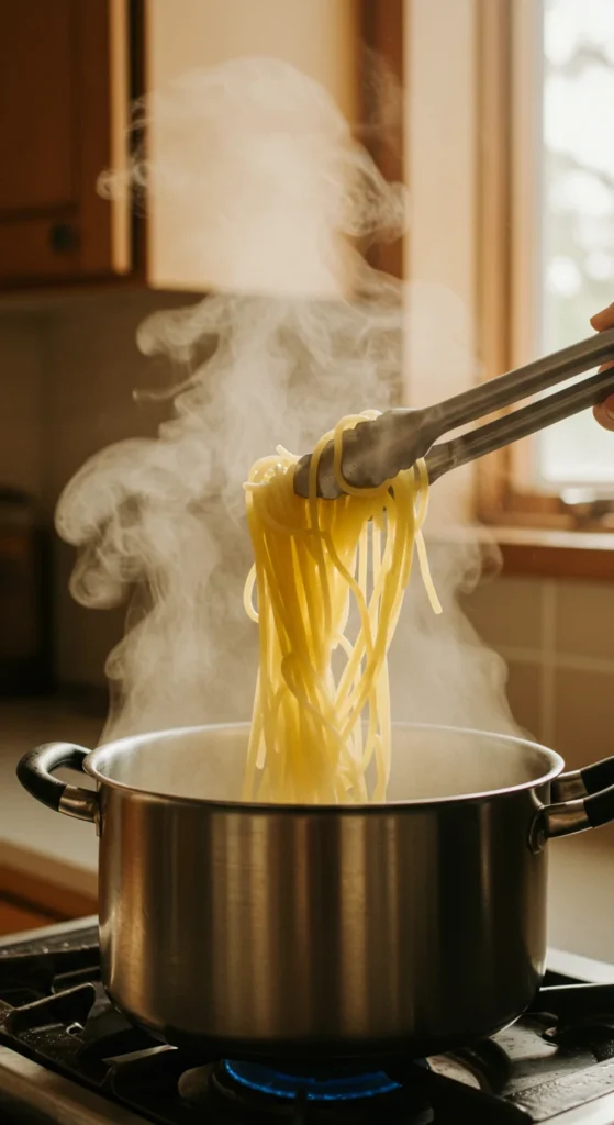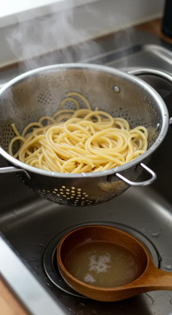 Before you drain the pasta, scoop out a cup of the cooking water. That starchy, salty water is liquid gold — it helps your sauce cling to the noodles and creates a silky texture.