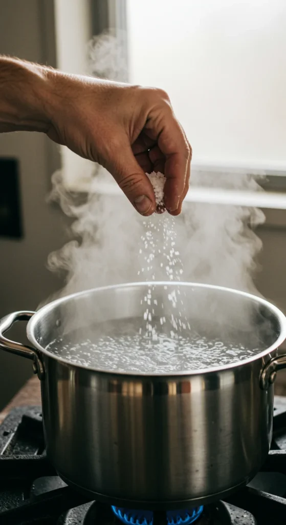 - Salt the water: Add about 1–2 tablespoons of salt once the water starts boiling. It should taste like a mild ocean — this is your only chance to season the pasta from within.