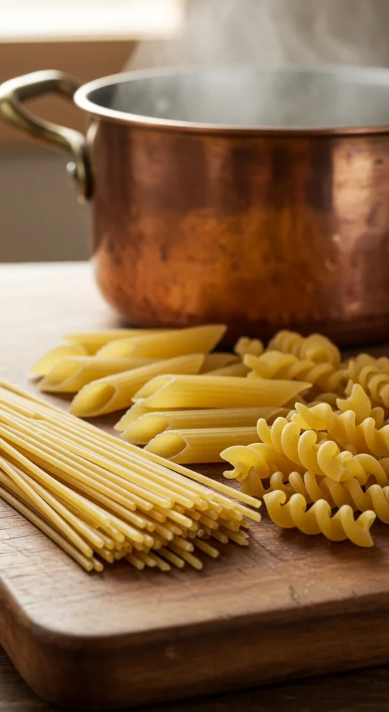 - Thick pasta (rigatoni, penne, fusilli): 10–12 minutes