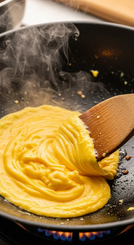 - Pour in the beaten eggs and scramble quickly. Once just set, transfer them to a plate.