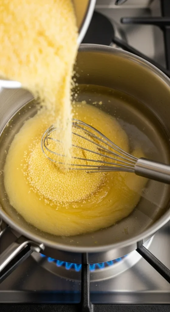 Traditional recipes tell you to whisk cornmeal into boiling water, but that’s how lumps form instantly. Instead: