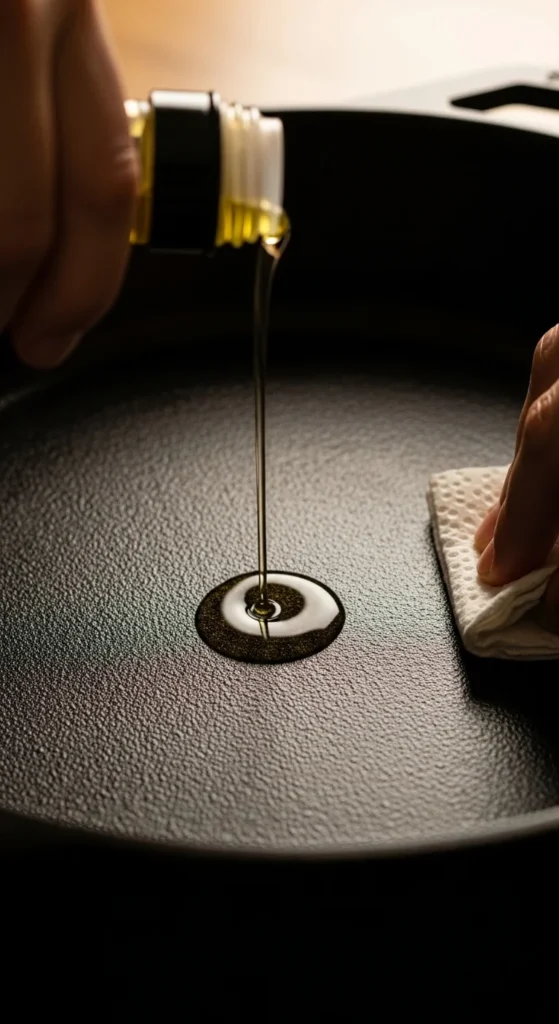 - Rub in oil – Add 1–2 teaspoons of oil and rub it evenly over the entire surface — inside, outside, and even the handle. Wipe off any excess until it looks just barely shiny.