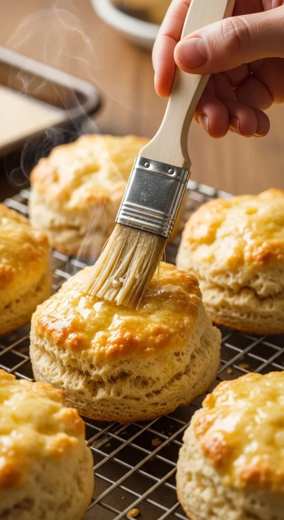 Right after the biscuits come out of the oven, brush them with melted butter.