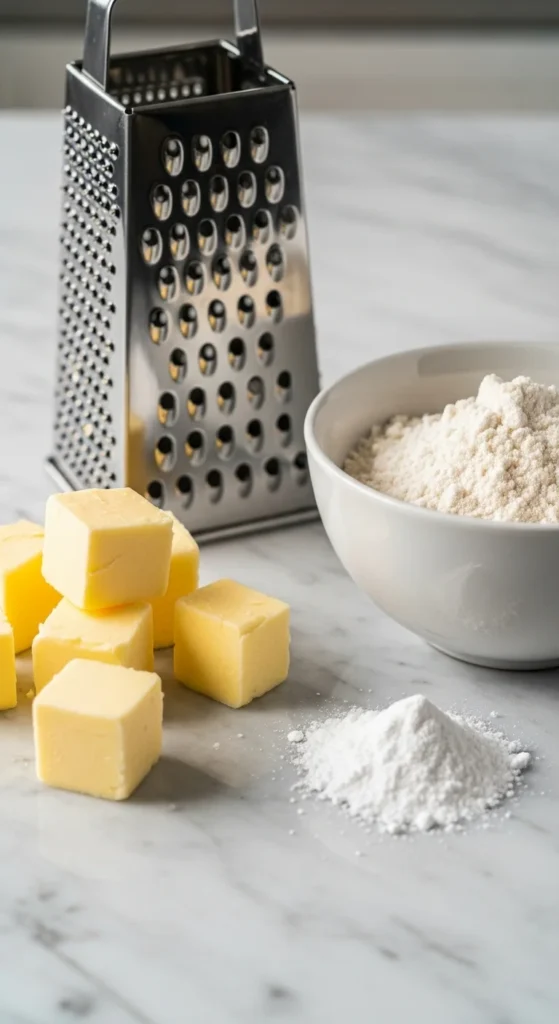Grated frozen butter is a game-changer — it distributes evenly while staying ice-cold.