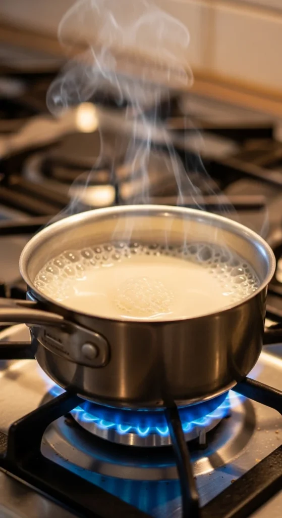- Warm until just simmering—small bubbles should appear around the edges, but don’t let it boil.