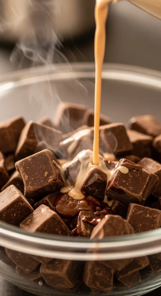 - Pour the hot cream over the chocolate, making sure all pieces are submerged.