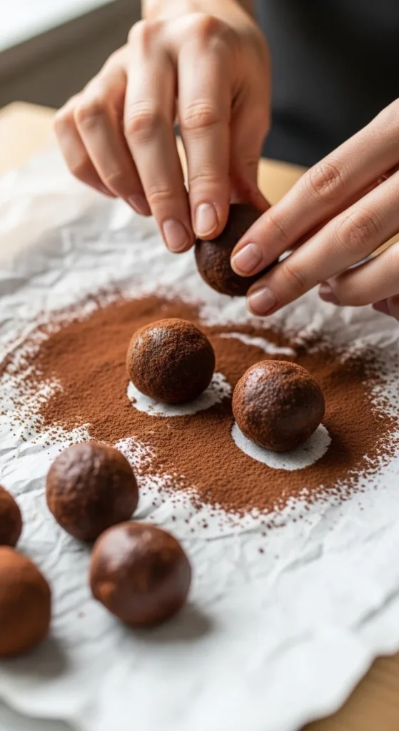 Once chilled, the ganache becomes firm enough to scoop and roll into small balls. These balls are then coated in ingredients like cocoa powder, melted chocolate, or chopped nuts.
