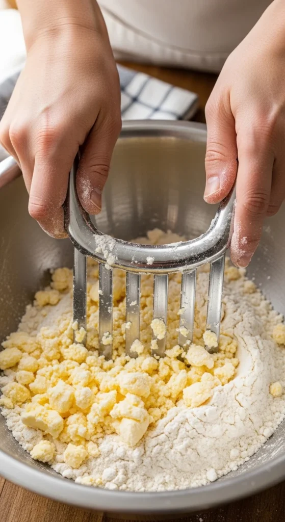 Add cold, cubed butter to the flour mixture. Use a pastry cutter or your fingers to work the butter in until the mixture looks like coarse crumbs. Tiny pieces of butter should still be visible—they melt during baking and create those flaky layers we love.