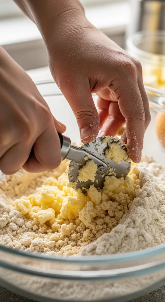 - Use a pastry cutter, two knives, or your fingers to cut butter until the mixture resembles coarse crumbs with pea-sized pieces.
