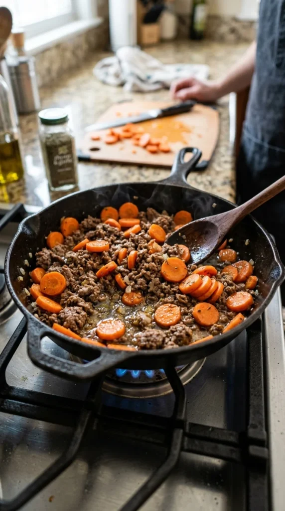 - Cook beef in a pan over medium heat for 6–7 minutes.