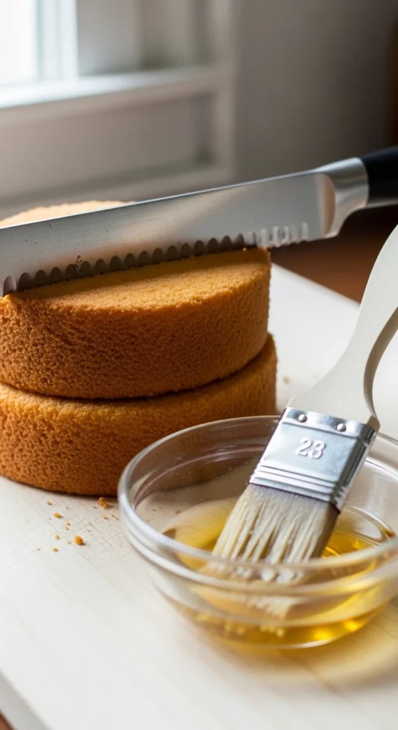 - Brush each layer lightly with simple syrup (optional, but helps moisture).