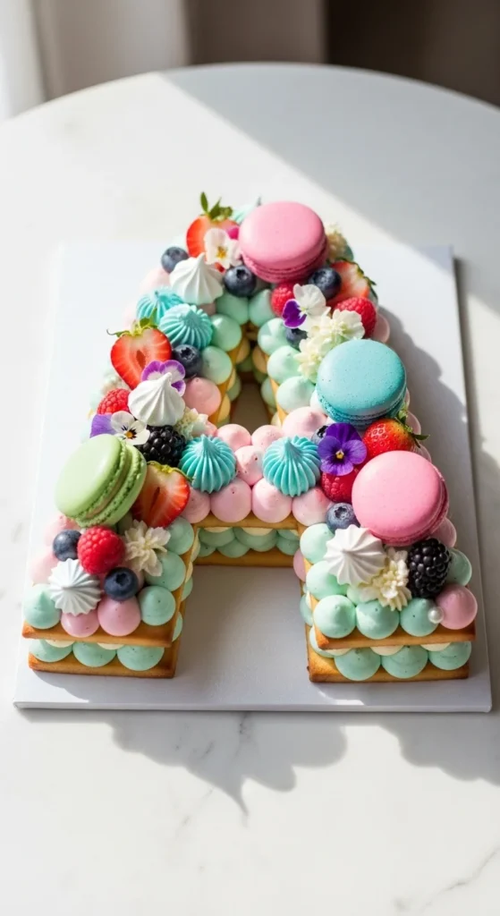 Letter cakes are fun, modern, and completely customizable. Think soft buttercream “kisses,” colorful macarons, fresh berries, and little flowers scattered across the top like edible confetti. They look bakery-level fancy… but they start with the simplest thing ever: a sheet cake and a paper template.