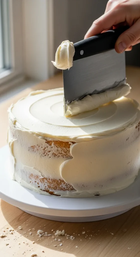 Spread a very thin layer of frosting over the whole cake. This isn’t for coverage — it’s just to seal crumbs and lightly coat the sides.