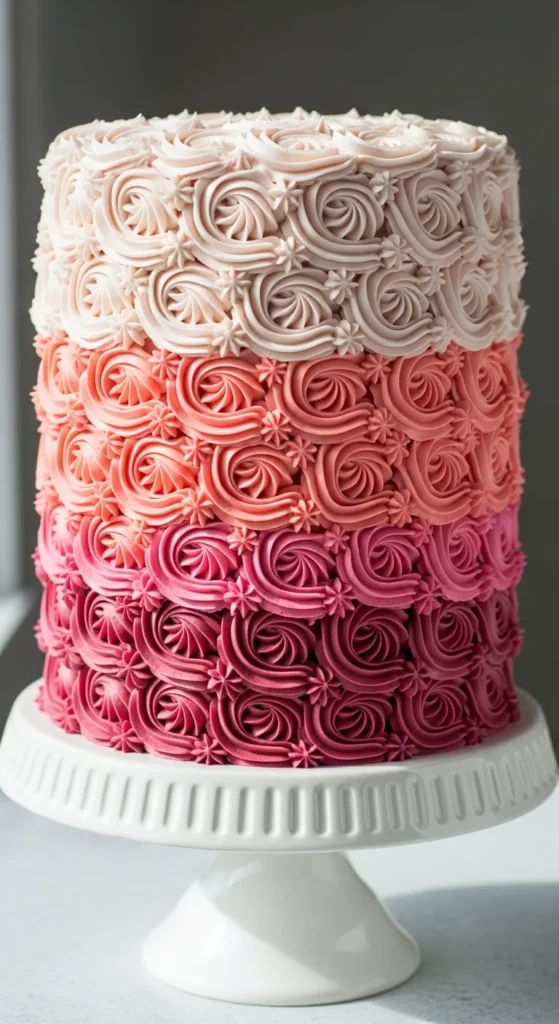 Rows of soft buttercream roses wrap around the cake like petals on a bouquet. Add an ombré color fade and suddenly your homemade cake looks wedding-worthy, birthday-ready, and totally Pinterest famous.