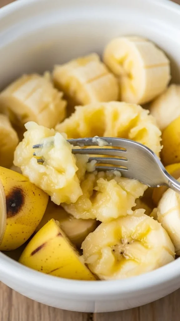Mash bananas until mostly smooth, with just a few small lumps. Overly chunky bananas can create uneven texture.
