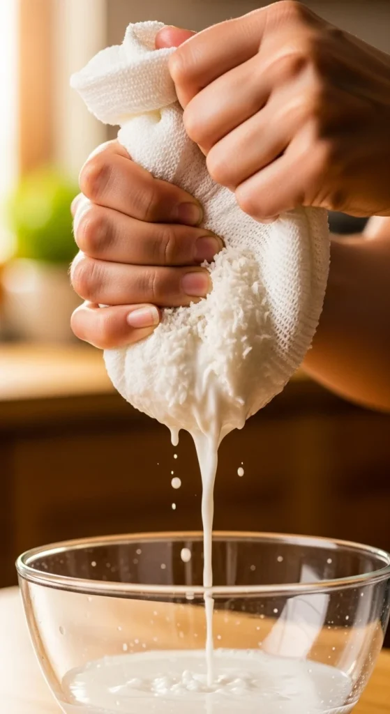 Once blended, it’s time to separate the liquid from the pulp. This step gives you that smooth, creamy coconut milk texture.