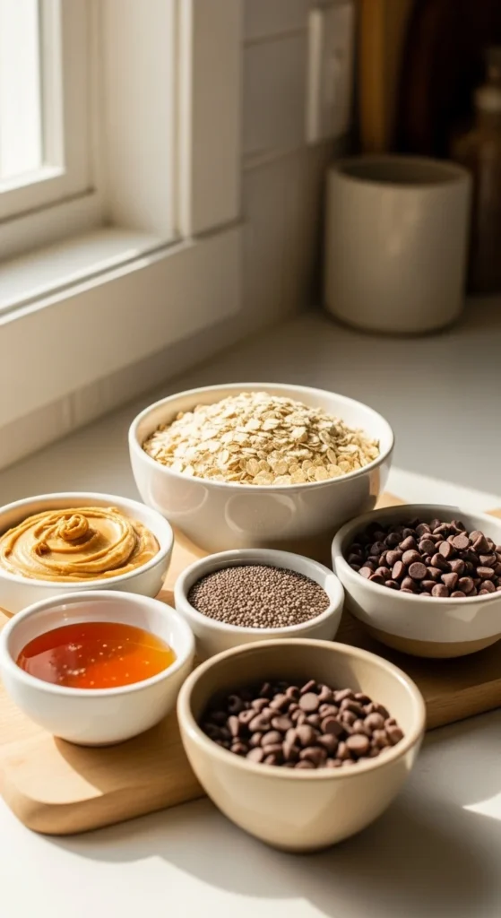 Start by combining your wet ingredients — nut butter, honey, and vanilla — in a large mixing bowl. Stir until smooth. Then, add your dry ingredients — oats, chia seeds, and any add-ins like chocolate chips or raisins.