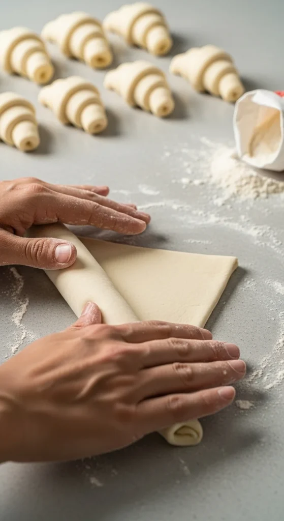 Starting from the wide end, roll each triangle tightly toward the tip, creating that classic croissant shape. Curve the ends slightly into a crescent if you like.