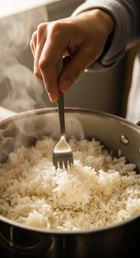 After resting, fluff the rice gently with a fork — not a spoon — to separate the grains without breaking them.