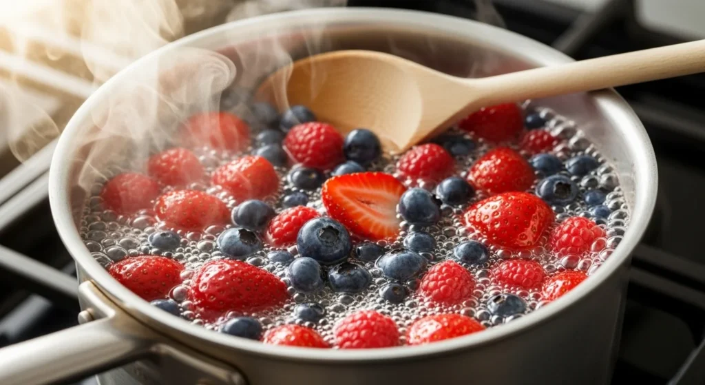 You’ll see the fruit breaking down slightly and the sauce thickening naturally as the sugar dissolves.