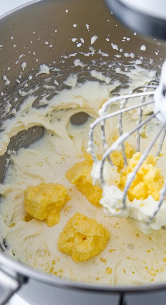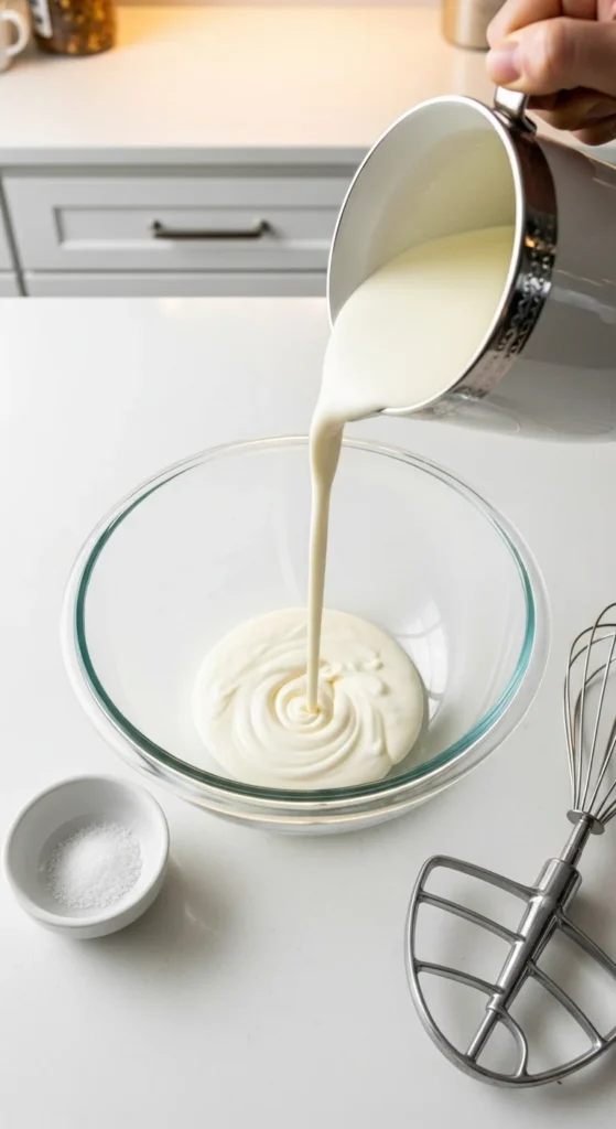 Pour your heavy cream into the mixing bowl and start whipping on medium-high speed. At first, it’ll look like you’re making whipped cream. Keep going—it will pass the soft peak stage and become grainy as the butterfat separates from the liquid.