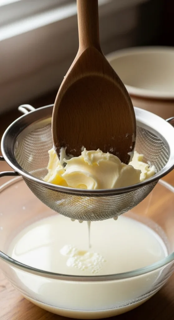 Pour the mixture through a strainer or cheesecloth over a bowl to separate the butter from the buttermilk. Don’t throw away that liquid—it’s real buttermilk and can be used in baking, pancakes, or salad dressings.