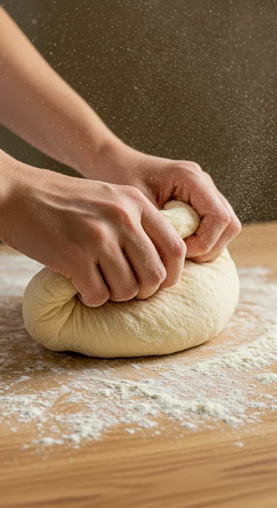 This kneading step builds gluten — the structure that gives pizza dough its chewiness and stretch.