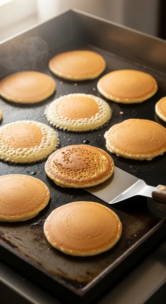 - Wait for bubbles. Flip only when bubbles appear and the edges look slightly set—about 2–3 minutes.