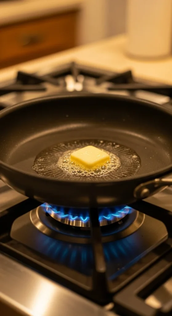 Use a nonstick or well-seasoned skillet, about 8 inches wide — perfect for a 3-egg omelet. Place it over medium-low heat and melt the butter, swirling it around until it coats the surface evenly.