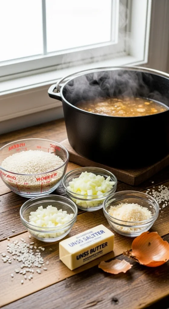 - Arborio, Carnaroli, or Vialone Nano rice — these short-grain varieties have high starch content and firm centers that hold up during slow cooking.