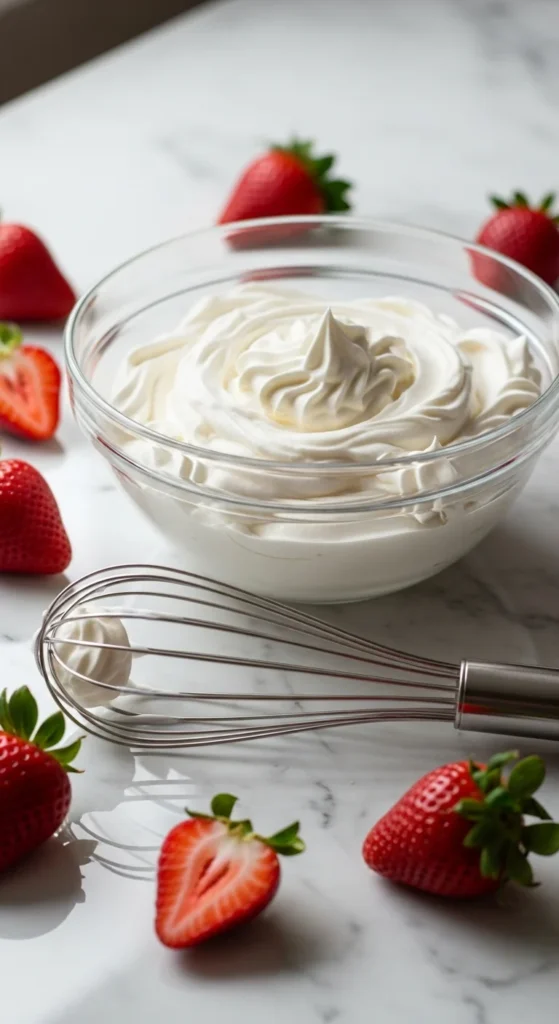 Pro Tip: Chill your bowl and whisk in the freezer for 10–15 minutes before starting. Cold tools help the cream whip faster and stay fluffy longer.