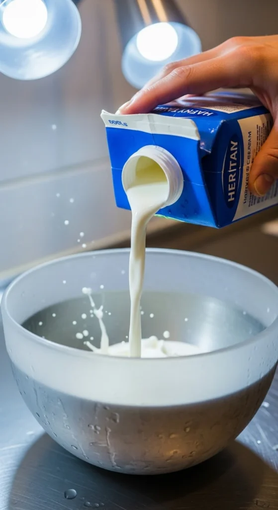 - Pour your cold heavy cream into the chilled bowl.