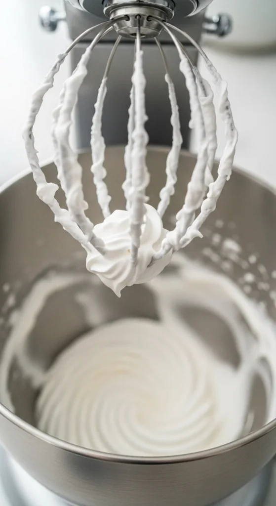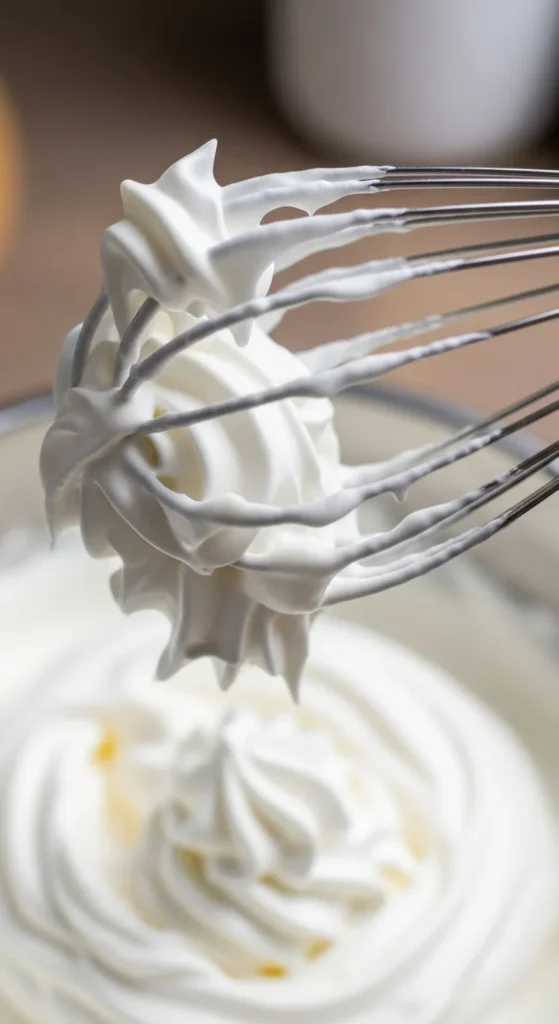 Now the real transformation begins! Keep whisking on medium speed until soft peaks start to form. When you lift your whisk, the cream should gently curl at the tip — smooth, shiny, and cloud-like.