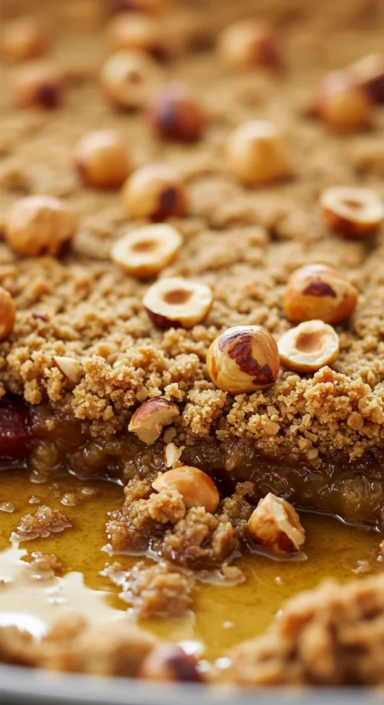 - Combine oats, hazelnuts, and butter; sprinkle on top.