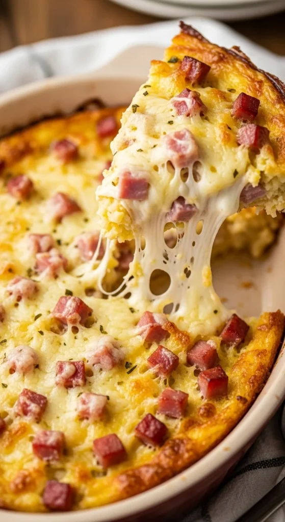 A hearty casserole that combines hash browns, ham, and creamy eggs.