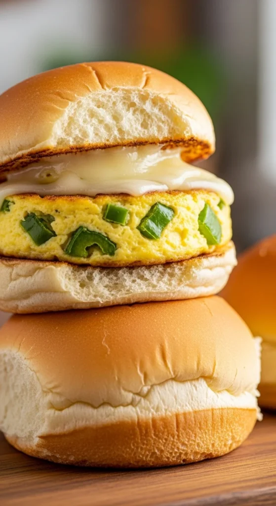 - Layer sausage slab, egg, and pepper jack slices. Top with roll lids.