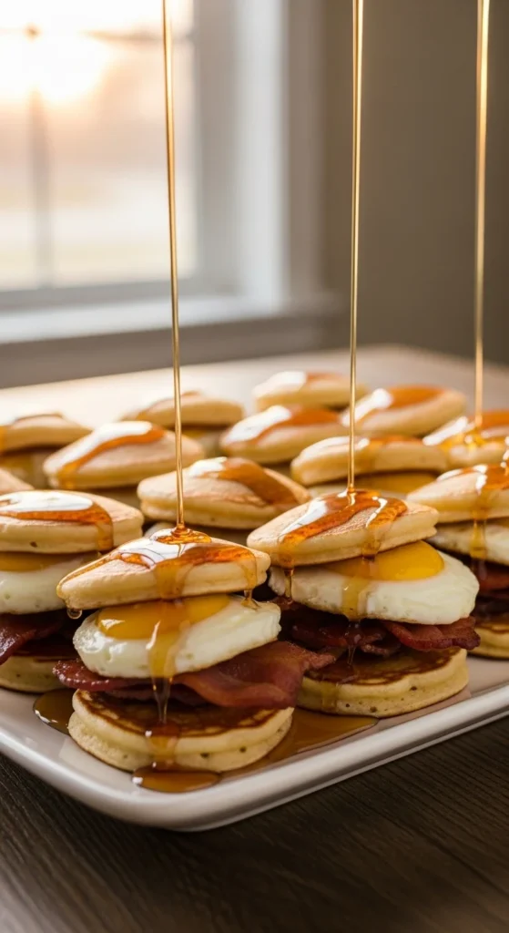 - Assemble sliders: pancake, scrambled egg, bacon pieces, drizzle of maple syrup, then another pancake.