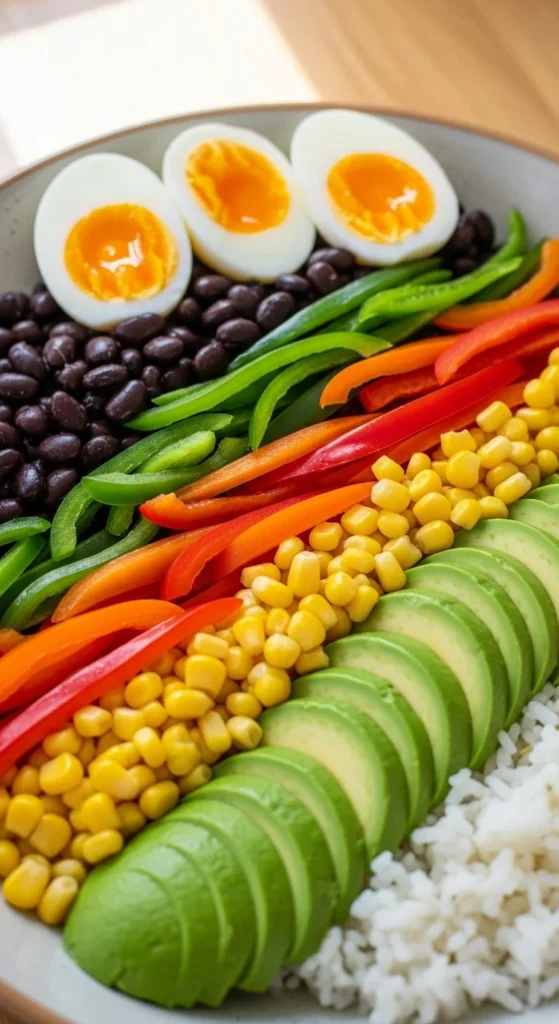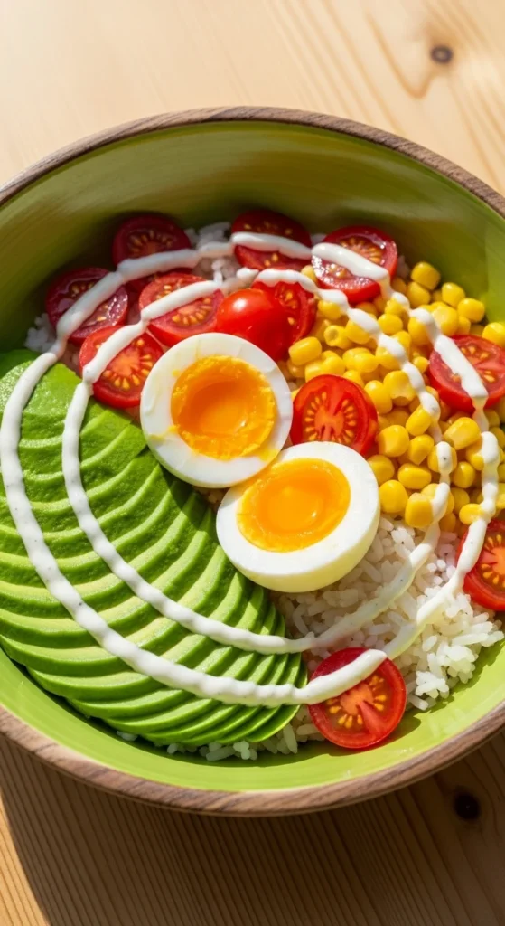 - Layer rice, eggs, and veggies.