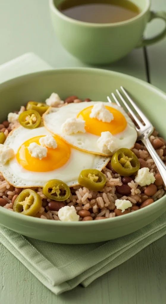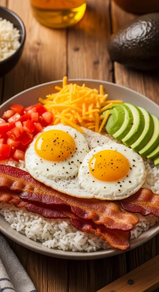 - Build bowl with rice, eggs, and beans.