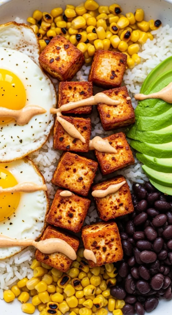 - Build bowl with rice, tofu, eggs, and beans.