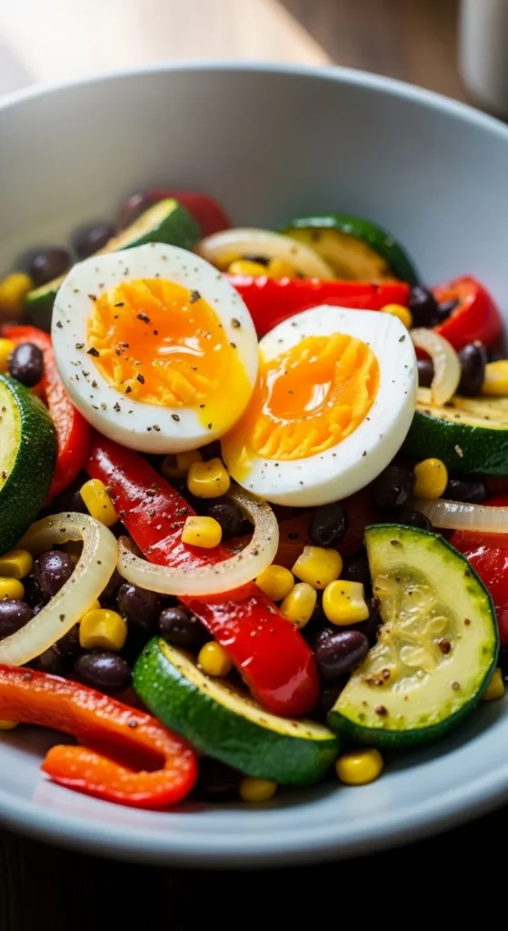 - Add beans, corn, and eggs.