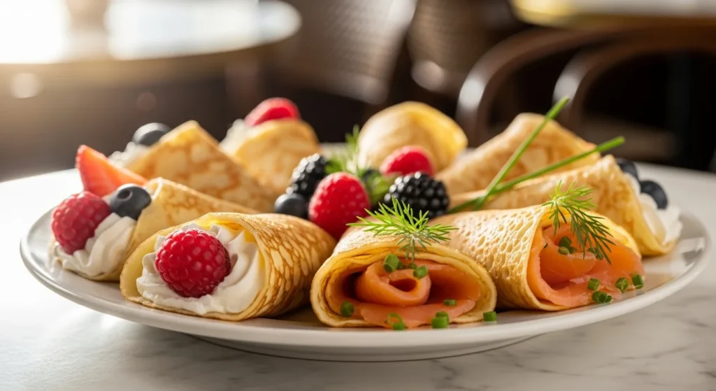 Crepe-roll brunch plates offer soft textures, pretty spirals, and a touch of French charm—perfect for starting the New Year with something beautiful and simple. Try your favorite combinations, swap flavors based on the season, or build a brunch platter filled with both sweet and savory options. These rolls store well, serve well, and always look camera-ready.
